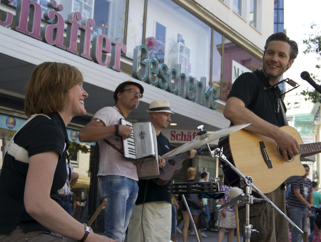 Als unsere ehemalige Cajon-Spielerin Claudia nach einigen Jazzkonzerten mit frischen Ideen um die Ecke kam tauschten wir kurzerhand mal die Instrumente und ich stellte fest: Cajon spielen machte Spaß! So bin ich bei diesem Instrument geblieben und begleite Ralf und Thomas zusätzlich mit Backroundgesang.